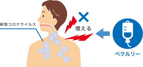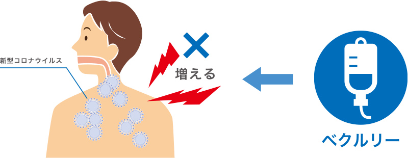 ベクルリーは、抗ウイルス剤という種類の薬で、新型コロナウイルスが体内で増えるのを抑えます。ベクルリーは、新型コロナウイルスが増殖する過程を邪魔することで、抗ウイルス作用を発揮します。