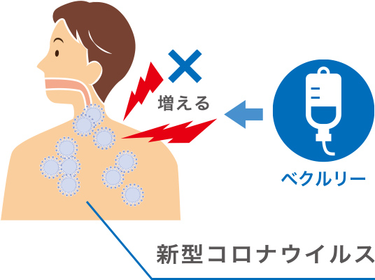 べクルリーは、新型コロナウイルスが増える際の複製という過程で必要な酵素のはたらきを邪魔して、ウイルスの増殖を抑えます。