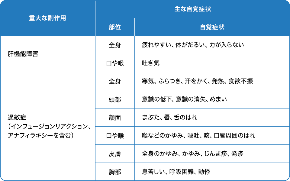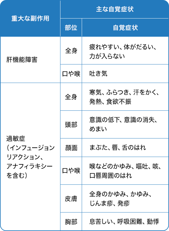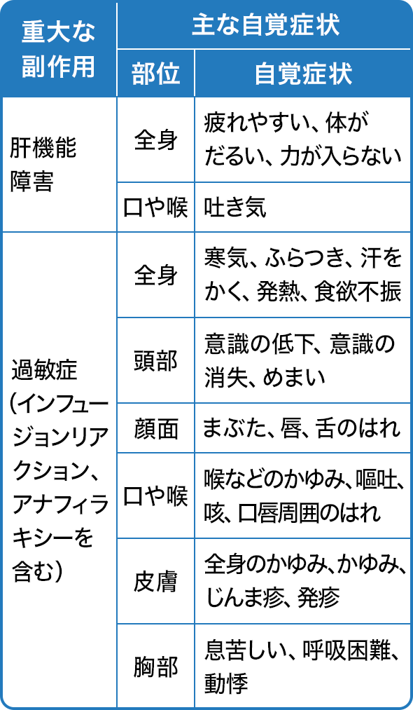 現れる可能性のある重大な副作用と、それぞれの主な自覚症状は以下のとおりです。