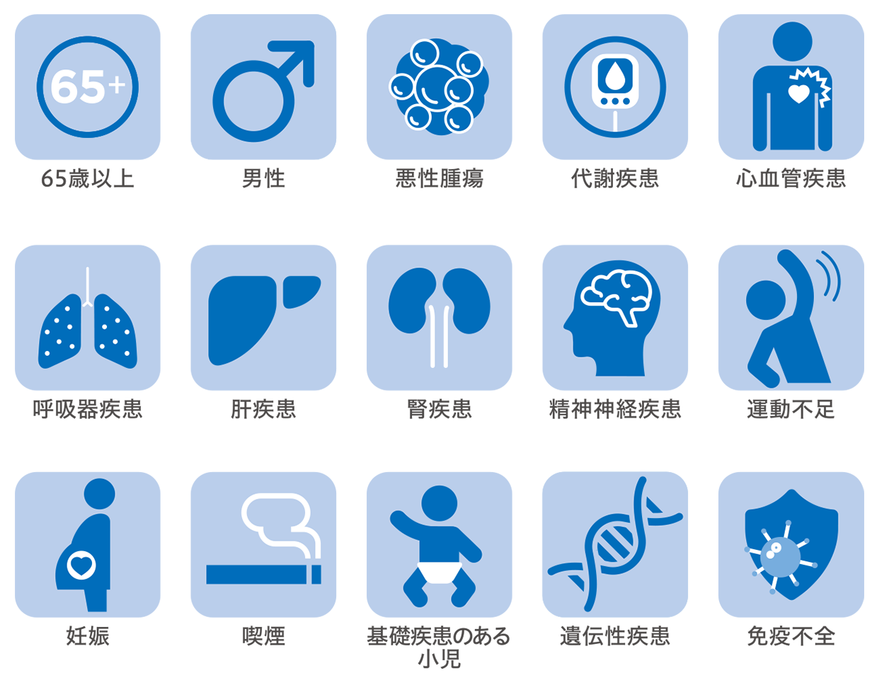 COVID-19の主な重症化のリスク因子1)は以下のとおりです。